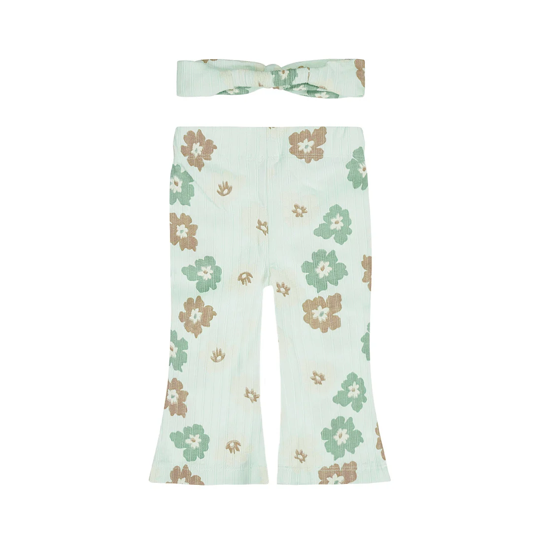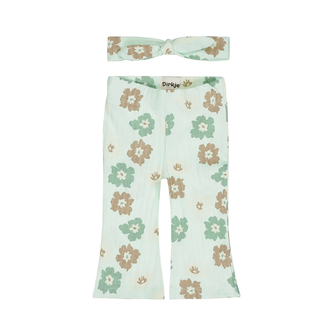 Vesela odeća za letnji dan. Ove Dirkje lepršave helanke sa trakom za glavu napravljene su u svetlo zelenoj boji sa razigranim cvetnim printom i tkaninom suptilne teksture. Helanke za devojčice imaju proširene noge za moderan izgled i udobne su zahvaljujući mekoj tkanini. Odgovarajuća traka za glavu sa mašnom upotpunjuje odeću i dodaje slatki dodir.