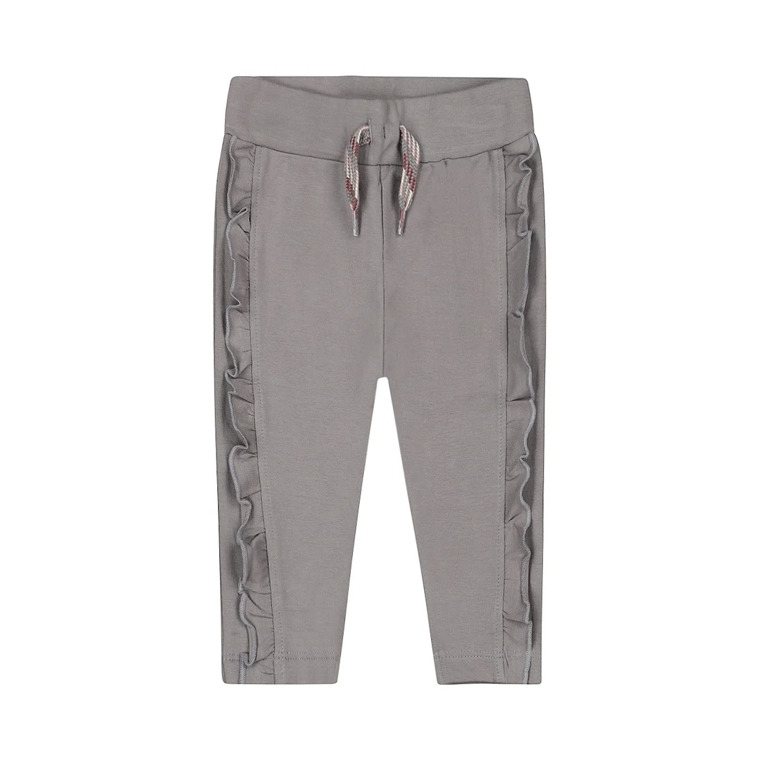 Napravljen od mekog pamuka sa rastezljivošću za optimalnu udobnost, savršen za svakodnevno nošenje. Simpatični volani duž nogavica daju pantalonama razigrani izgled, dok neutralna siva boja olakšava kombinovanje sa ostalim artiklima iz kolekcije Dirkje.