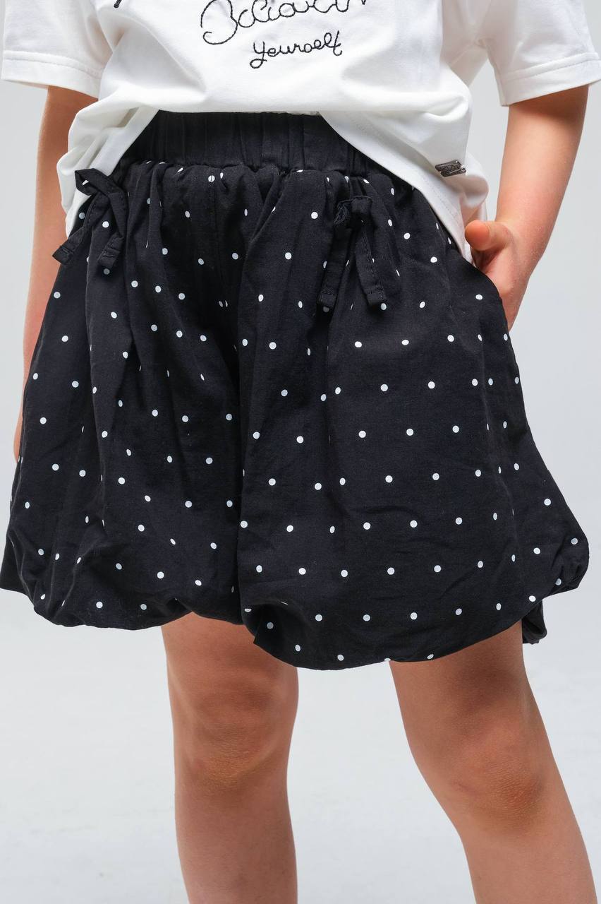 Inovativna suknja-šorc: Crna suknja sa belim tufnicama krije praktičan šorc ispod slojeva bogato naboranog materijala. Ovaj dizajn omogućava devojčicama da se nesmetano igraju, trče i skaču, zadržavajući pritom izgled elegantne suknje.