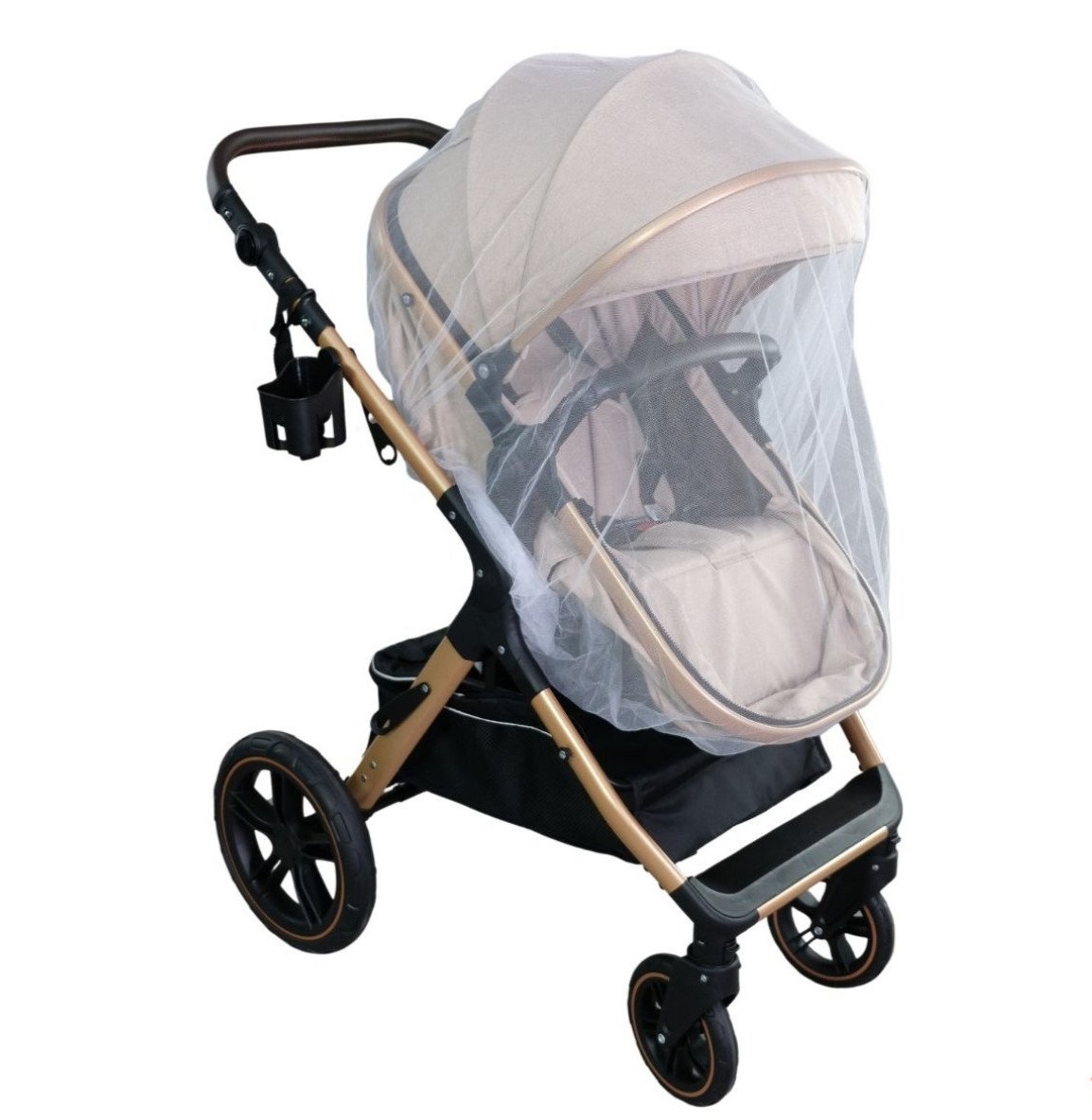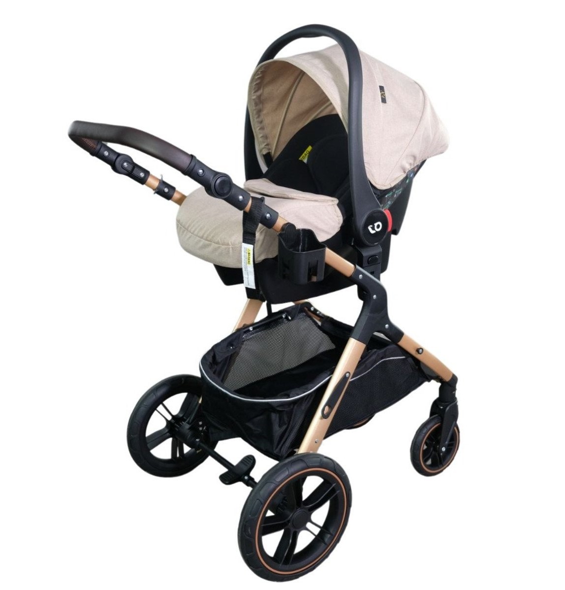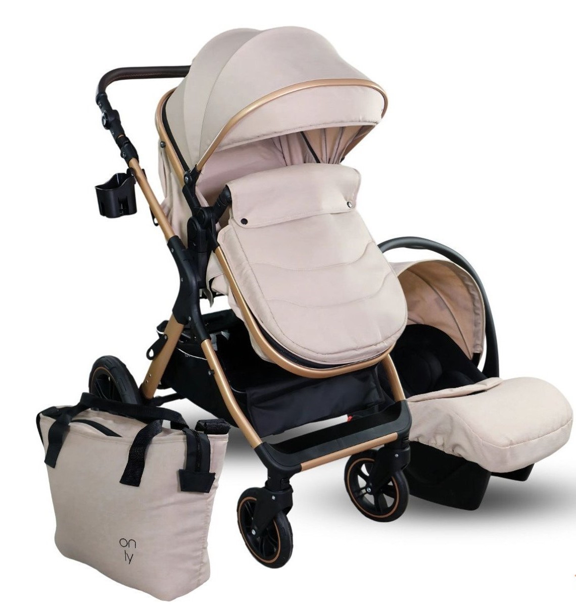 U kompletu se nalazi i I-size auto sedište proizvedeno po najnovijem standardu koje se može postaviti na ram od kolica, navlaka za noge, torba za mame, mrežica za komarce i držač za flašice.
