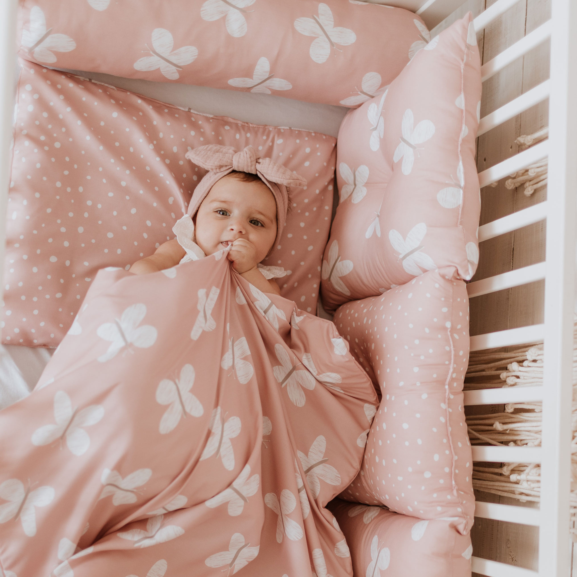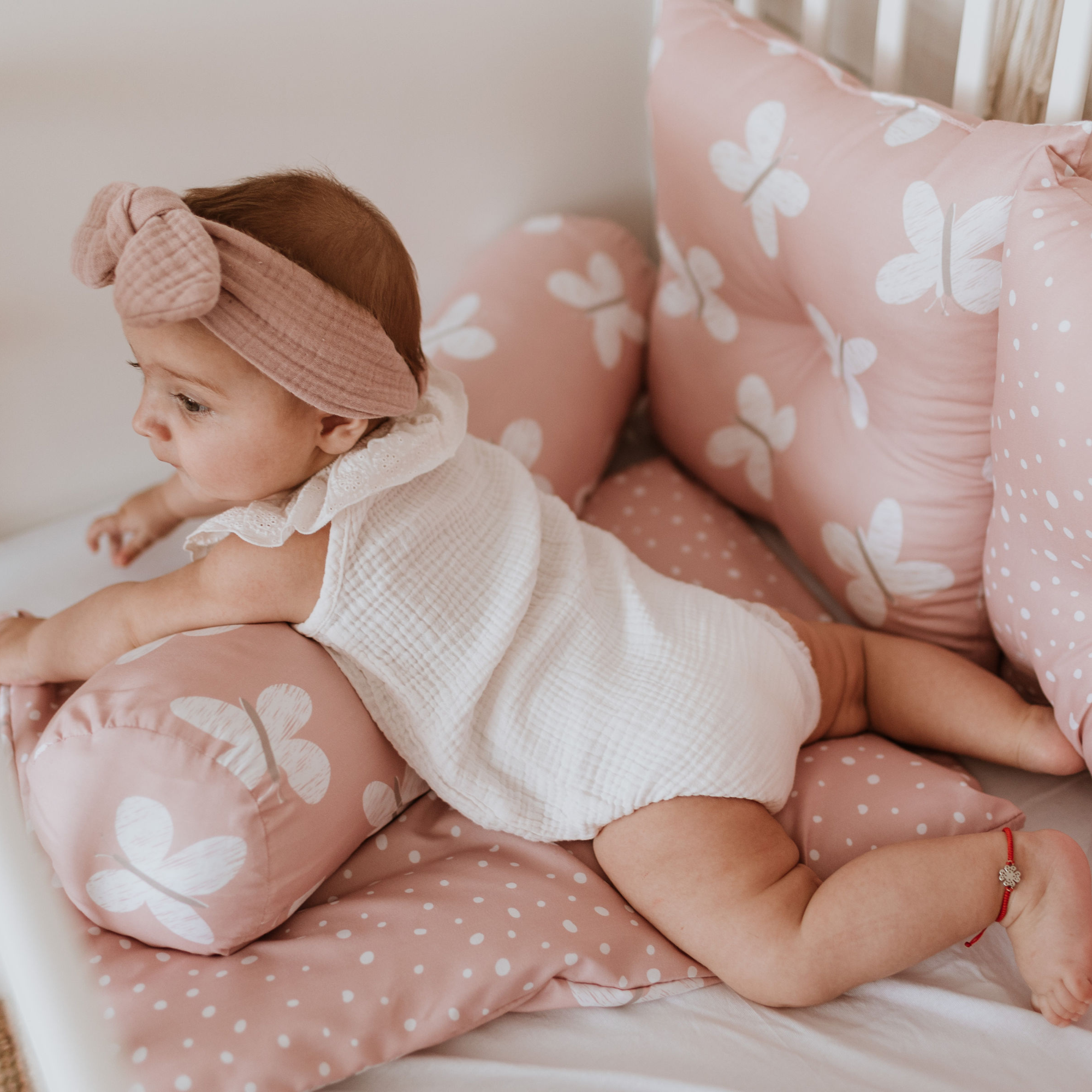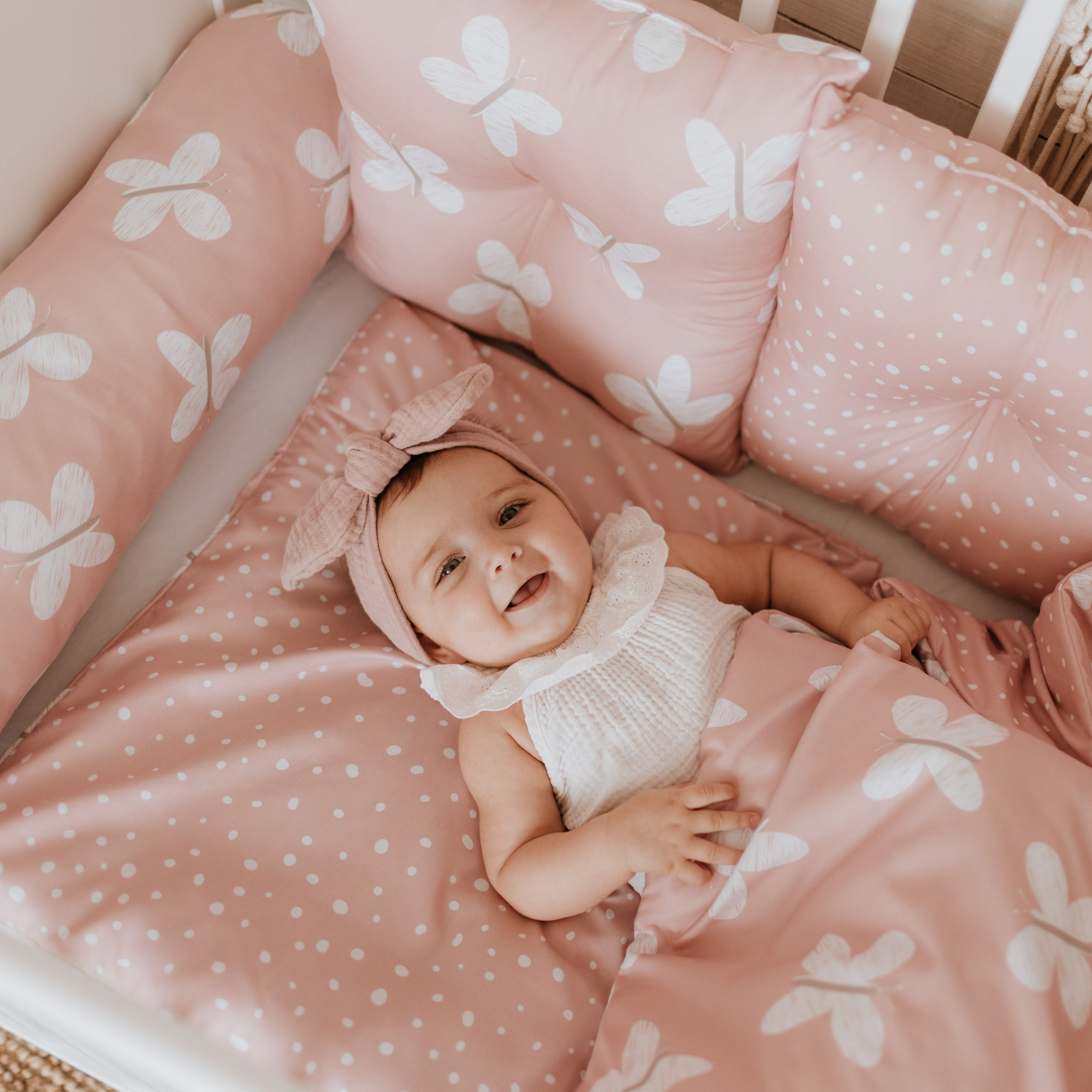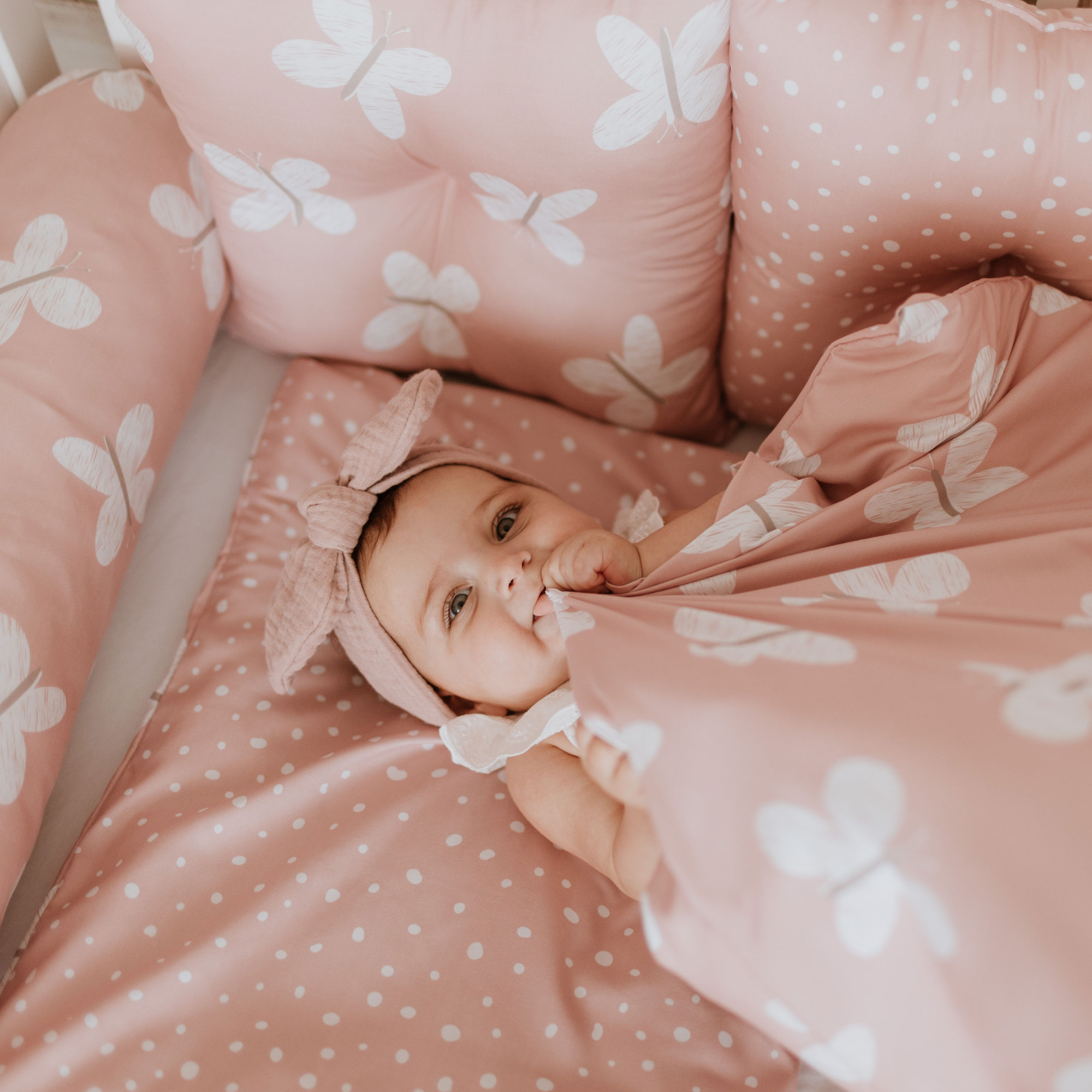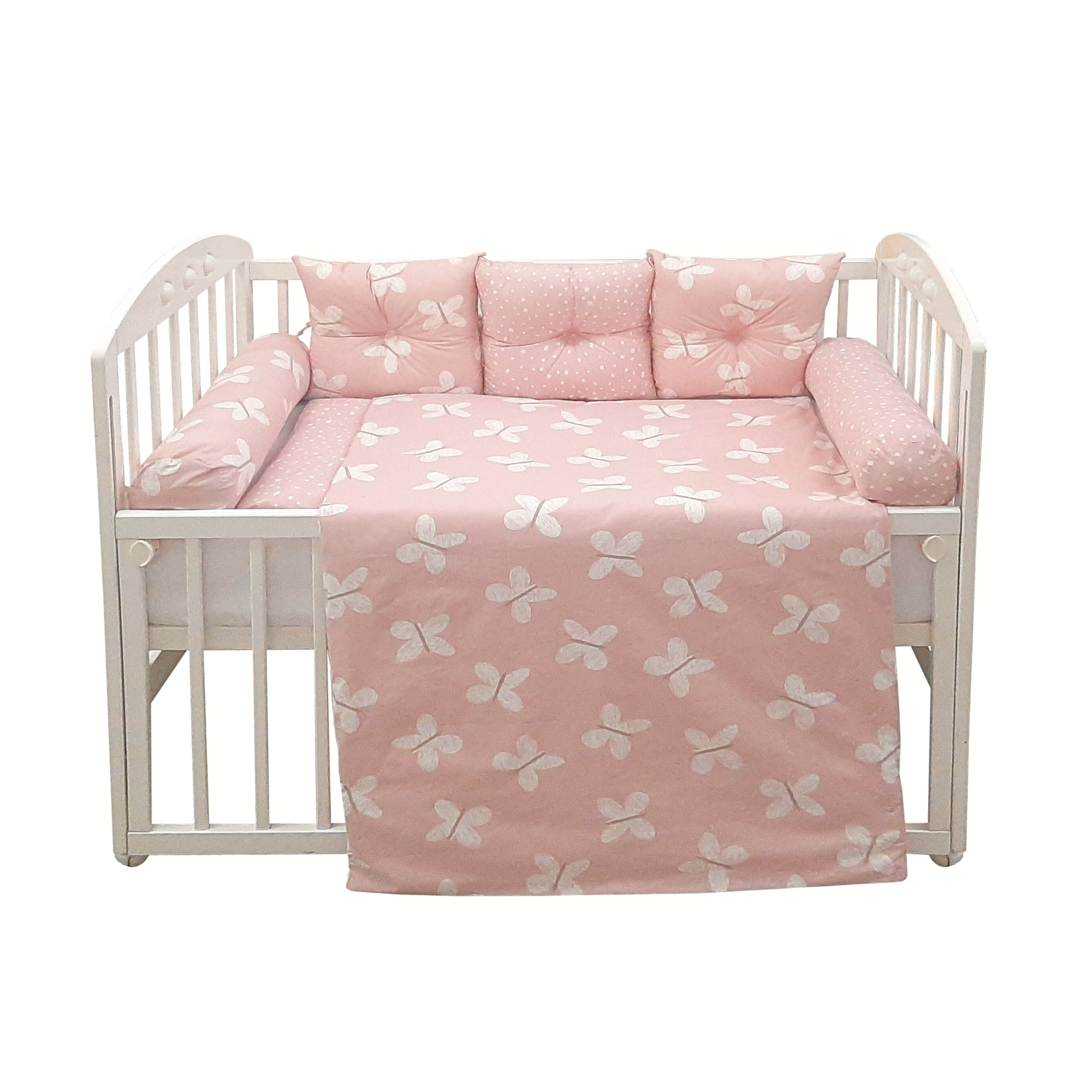 Komplet Leptirići je prepun divnih detalja – na kompletu su elementi koji su jednostavni a opet toliko romantični da će soba Vaše bebe ličiti na pravu bajku. Komplet u svom sastavu sadrži čak 2 valjka, koji su veoma korisni za vašu bebu – najpre kao zaštita a zatim i kao motorička podrška tokom cele prve godine. Sadržaj kompleta: jastuče i navlaka za jastuče 40x50cm, jorgan i jorganska navlaka 120x80cm, donji čaršav lastih 120x60cm, jastučići ogradica-3xjastučići dugmence, 2xvaljak