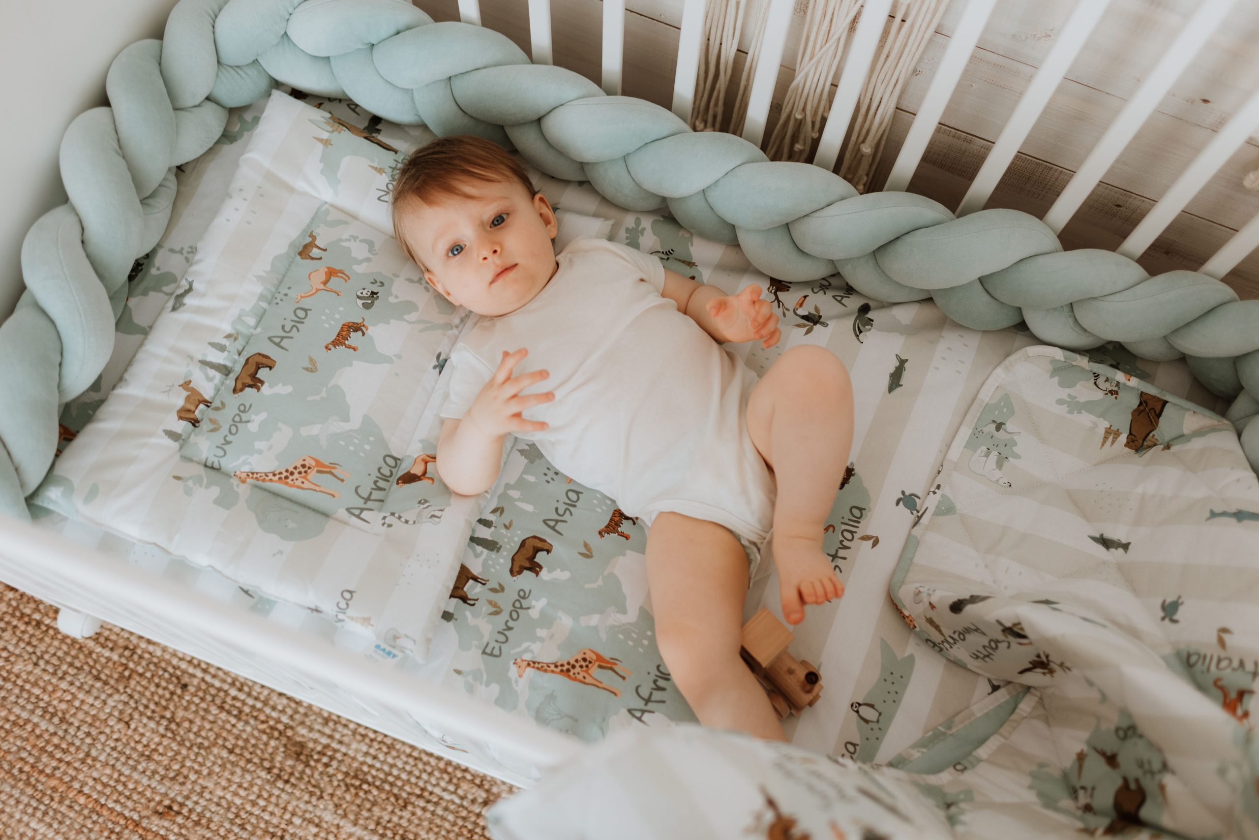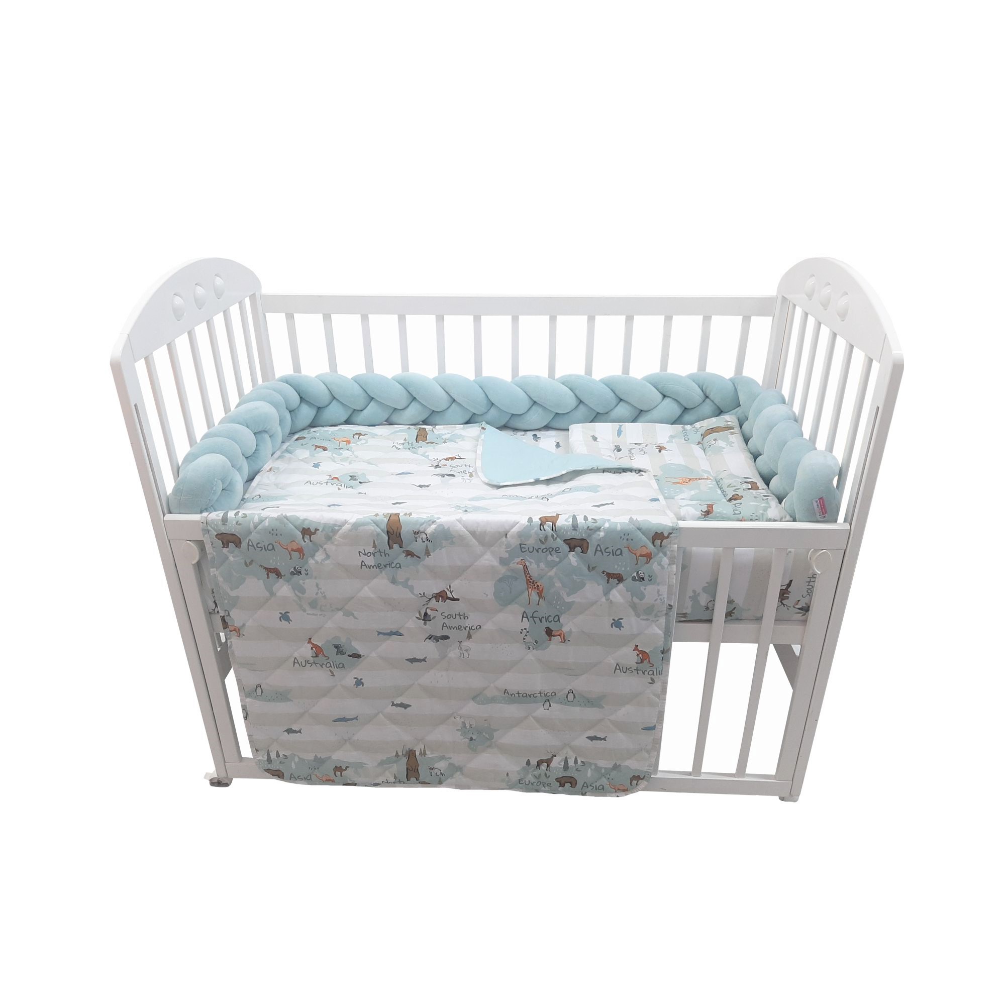 Ovaj jedinstven komplet sadrži dovoljno elemenata za udobno i bezbedno spavanje, sasvim dovoljno da beba ima puno prostora. Predivan dezen ulepšaće čitavu prostoriju svojom vedrinom, živim i veselim bojama, koje su izuzetno prijatne za bebine oči.