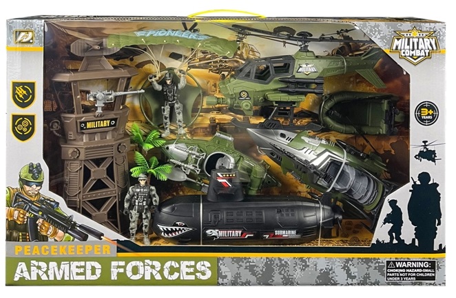 Ovaj vojni set uključuje osmatračnicu, helikopter, podmornicu, padobranca, čamce, dva vojnika i razne vojne dodatke, pružajući sate kreativne igre. Svaki detalj je pažljivo izrađen, a čvrsta konstrukcija omogućava realističnu i dinamičnu igru.